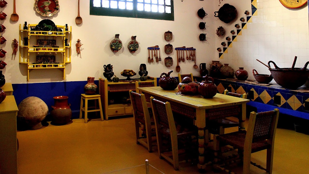 The sixth and seventh rooms are the kitchen and dining room. Both are in classic Mexican style, with bright yellow tile and the floor, blue and yellow tile counters and a long yellow table, where sister Ruth stated that Frida spent much of her time. The two rooms are filled with large earthenware pots, plates, utensils, glassware and more which came from Metepec, Oaxaca, Tlaquepaque and Guanajuato, all known for their handcrafted items. Decorative features include papier-mache Judas skeletons hanging from its ceiling, and walls with tiny pots spelling the names of Frida and Diego next to a pair of doves tying a lovers' knot.